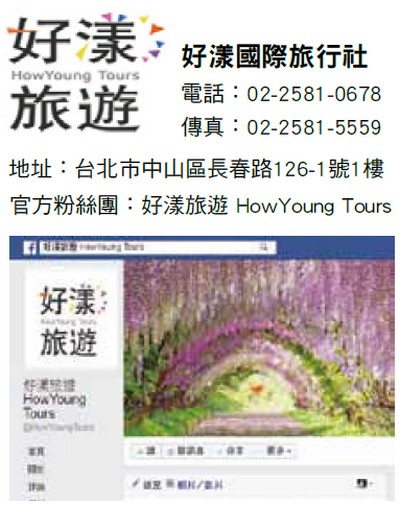 好漾旅遊目前推出名人帶路系列「京 都有馬米其林溫泉漫遊」、針對女性客 群的「好姊妹的小奢華輕旅5日」、賞紫 藤花「關東私發見‧秘境花賞5日」、江 戶風情和服體驗「關東、湯西川雪洞祭5 日」。