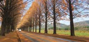 牧野高原有一條長約2.4公里的水杉林蔭道,道 路兩邊是筆直往天空伸展的水杉,共約500株。 這裡的水杉最高超過一百公尺,遠遠望去十分壯 觀,加上四季風景截然不同,春夏為新綠、秋天 的紅葉以及冬天的銀白,尤其是紅葉季節更是吸 引來自各地的賞楓遊客前來拍照,動人的景觀也 被評選為「新‧日本行道樹百景」。此外,周邊 的牧野高原有溫泉及滑雪設施,牧野採摘園提供 水果、栗子等採收果物體驗,與美麗的水杉林蔭 道風景包裝在一起更為吸睛。