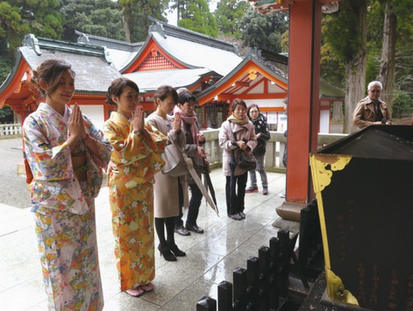以神話為起源地的霧島神宮每年會吸引150萬人次造 訪,除欣賞神宮建築,現在也可體驗和服。共有90套 和服提供選擇,專人換裝過程約15分,可外出至霧島 神宮參拜拍照留念,費用為3000日幣。