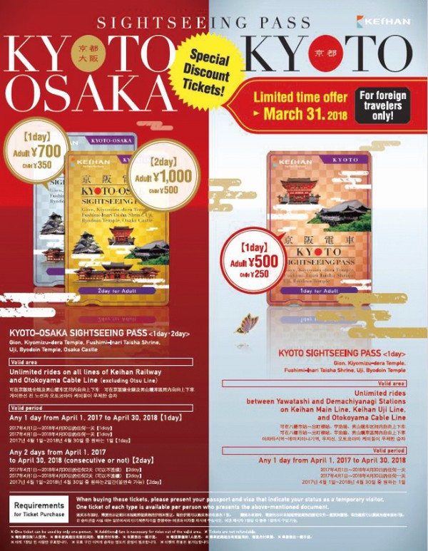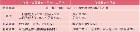 京阪集團旗下營運的京阪電鐵,路線網分布於大阪府、京都府與滋賀縣境內。沿 線有大阪城、伏見稻荷大社、清水寺等熱門景點,還有通往平等院的宇治線以 及穿梭琵琶湖沿岸,連接京都與滋賀大津的大津線等多條線路。京阪電鐵針對海外觀 光客所推出的超值觀光乘車券,包含「京都、大阪觀光一日券、二日券」以及「京都 觀光一日券」,不但提供超值乘車優惠,還可於20處以上的場所分別享有特別折扣或 是精美禮品等,配合周邊景點宣傳讓商品更具吸引力。同業在包裝FIT或團體商品時 亦可省下不少車資,不論是少量或大量購買皆可,歡迎洽詢向日遊顧問公司。