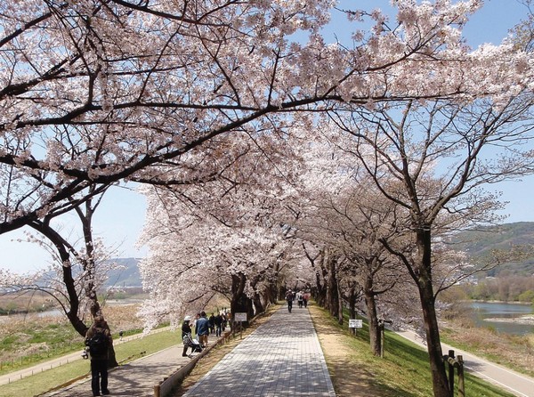 位於京都八幡市站周邊的「淀川河川公 園-背割堤地區」,是關西地區熱門的賞 櫻名所。由250株染井吉野櫻排列而成長 達1.4km櫻花隧道,兩側有宇治川與木津 川包夾。每逢櫻花季都會吸引近20萬名 遊客前來朝聖。
