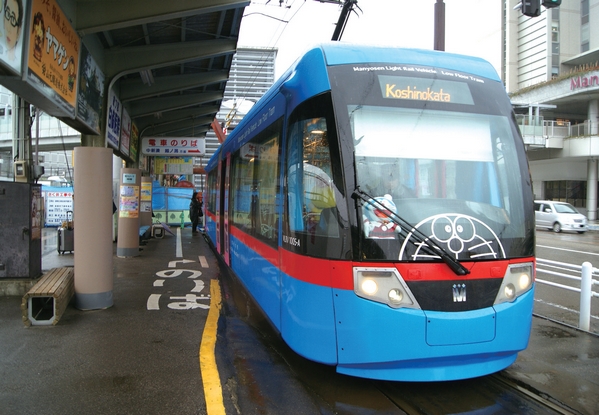 高岡市為《哆啦A夢》作者藤子‧F‧不二雄的故鄉,而從高 岡車站出發的萬葉線路面電車,特別打造成「哆啦A夢彩繪列 車」,電車車門就是秘密道具─任意門,車廂內也描繪了各 個角色及道具,15名以上團體即可預約,高岡車站還有哆啦A 夢銅像及郵筒,是超人氣必訪景點,自高岡車站出發每天7個 班次,每週一車輛檢查停止運行。