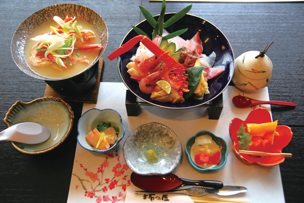距離高岡車站徒步約15分鐘的「海鮮問屋柿之匠」,可品嘗 來自富山灣的美味海鮮料理,店內可容納最多160名旅客,海 鮮御膳、海鮮蓋飯御膳1,500日圓(未稅),也有海鮮生魚片 御膳、壽司會席、螃蟹會席等選擇,加上周邊有許多觀光名 勝施設,非 常推薦團體 在此享用午 餐,並設有 停車場可停 大型觀光巴 士5 台, 全 年無休。