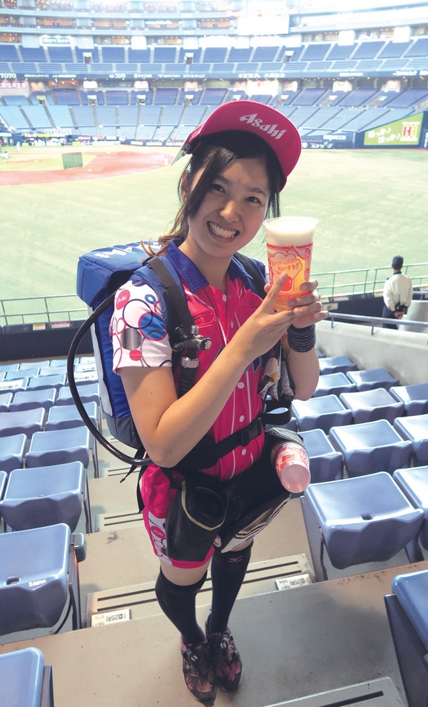 日本職棒觀賽的一大特色,就是穿梭在球場上特有 的啤酒女孩!全場有許多身上奔著總重超過12公斤 啤酒桶的女孩,熱情推薦,而大阪巨蛋的「佐藤真 由紀」,更曾在日本啤酒女孩比賽中拿下第二名佳 績。 (開車不喝酒)