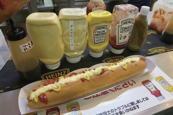 大阪京瓷巨蛋球場內有超過20家餐廳,從在地的大阪必嚐美味到球場 限定的特色餐點皆能找到,人氣第一的「攻擊熱狗堡」長度竟有30公 分,取餐台上的調味料十分豐富,可以依喜好特製出最完美的熱狗堡! 而球場各區都能買到受歡迎的炸雞棒(Toribo),外表酥脆,蒜味內餡 還保留肉汁,單手就能吃,搭配飲料觀賽最適合。