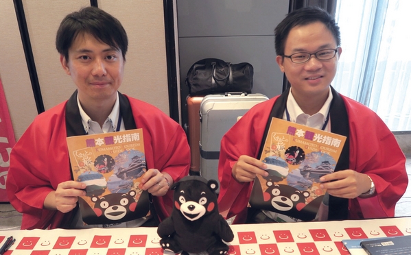 熊本縣商工觀光勞働部觀光經濟交流局觀光課 主任主事家入慎一郎(左)敘述,受到去年地 震影響,前往阿蘇的道路修復工程,將在9月可 望通車,從熊本機場前往南阿蘇地區可大幅縮 減30分鐘車程。而在3╱4上路,成為話題的全 新觀光列車「翡翠•山翡翠」號就是串連熊本—人吉地區,以棲息於球磨川沿 岸的二種鳥類來命名,每天行駛往返共6班,相對其他觀光列車,更容易預約。