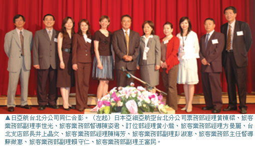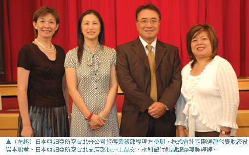 日本亞細亞航空台北支店部長井上晶文表示,今年夏天日亞航推出了許多針對個人旅遊所提出的優惠促銷方案,像是針對提早開票的Early Bird專案等等優惠措施,同時為了更貼近台灣地區旅客的需求,在10月之後台北飛東京航線將調整為每日上午和下午各2班,以更漂亮的時間帶回饋台灣地區消費者的支持,另外也將會整體FIT票價做更合理的制定,並繼續以精緻的日系服務提供給同業以及廣大的日亞航旅客。