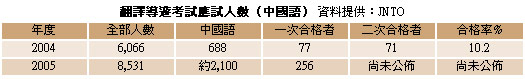 2005年翻譯導遊考試,開放外國人士也可報考。而配合正牌導遊制度的嚴格落實,在台灣業者間引起一陣驚慌。根據翻譯導遊考試代辦機構的國際觀光振興機構(JNTO)的統計資料顯示,今年參加考試較往年增加2成,為8,531人,台灣為816人(2004年為27人),光是台灣就成長約30倍(詳細請見下表)。但是據說今年台灣考過試的只有4名。針對這點,1月16日JTB的營業部長砂原泉,前來台灣與台灣導遊針對此考試做交流會。