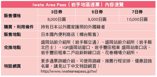 周遊岩手縣時,使用「IwateAreaPass(岩手地區通票)」能夠在有效期限內任意搭乘規定路線的巴士、列車。包含今年3月全線通車的「三陸鐵道谷灣線(久慈站~盛站)」、「岩手縣北巴士仙台機場‧松島平泉‧花卷線」、「銀河鐵道全線」等14條路線。也提供豐田租車13個分店三小時租車特點等優惠。此外,通票也附上岩手縣內飯店、商店、滑雪場等多達72項設施的服務‧折扣券。