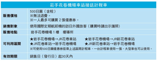 岩手縣針對使用國際定期航班機出發或抵達「岩手花卷機場」的訪日外國旅客,企劃出「岩手花卷機場」與「JR花卷車站(東北本線)」、「JR新花卷車站(東北新幹線)」之間的超值計程車優惠券。旅客購買500日圓優惠券後,回答填寫券上基本問題遞交給司機,即能搭乘機場接送計程車(限單程)。