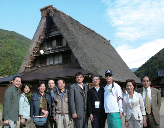 ▲考察成員們拜訪五箇山合掌村。(左起)J Mountains Group小泉伸太郎、J Mountains Group肥塚由紀子、鳳凰旅行社徐憲敏、鳳凰旅行社總經理廖文澄、菲美運通董事長李嘉寅、海邦旅行社董事長林成泰、天擎旅行社董事長許禓哲、國佳旅行社總經理陳照明、翻譯上崎廣惠、鷲岳滑雪場參與丸山均。