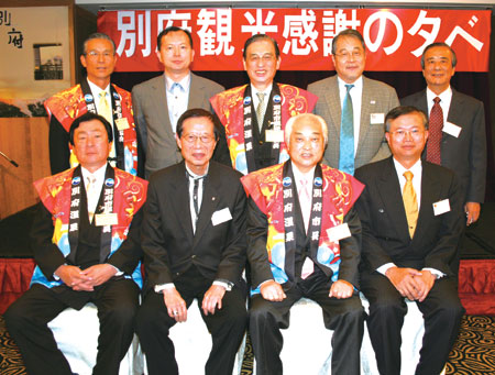 ▲(前排左起)別府市議會議長山本一成、台灣觀光促進會會長李慶寶、別府市長★田博、外交部日本事務會政務組組長黃水益;(後排左起)別府市議會觀光經濟委員會委員長野口哲男、外交部日本事務會副執行長蔡明耀、別府市觀光協會會長千壽健夫、日本觀光協會所長市川辰雄、台灣觀光協會顧問兼東北亞市場執行長曾前訓。