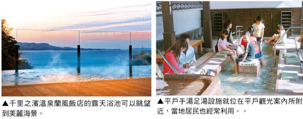 來到溫泉王國的日本,當然要泡個湯。平戶當地的溫泉泉質為碳酸氫鈉泉(重曹泉),特徵就是可以軟化角質,滋潤肌膚,泡完會覺得骨溜骨溜。除了千里之濱、田之蒲溫泉外,平戶市也在平成11年(1999年)另外挖到溫泉,取名為平戶溫泉。平戶溫泉除了是美人湯外,與眾不同的地方就是可以直接買回家泡。在平戶溫泉給湯設施,就能以20公升/10日圓的價格購入,只要拿著容器去裝,就能回家輕鬆泡個美人湯。而觀光客若未住宿,則可以在市區內的手湯足湯設施免費泡看看,同時提供手湯的設施在日本也是不多見。