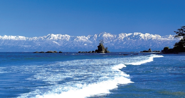 雨晴海岸位於能登半島國定公園範圍內,擁有白砂青松、海岸絕景使其入列「日本海岸百選」與「白砂青松百選」,也是近年來在網路上人氣爆紅的拍照地點。只要天氣良好時,雨晴海岸的視野就非常遼闊,可遠眺富山灣與海拔約3,000公尺立山連峰兩者一前一後、相互呼應而成的山海一色絕景,周圍還有奇岩怪石及海浪聲相伴,無論白天、日落都各有韻味,隨四季變化更是讓人著迷。