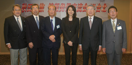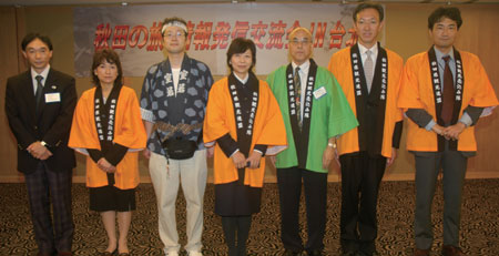 秋田縣代表合影。(左起)秋田縣產業經濟勞動部觀光課副主幹舛屋修美、秋田縣觀光聯盟事務局次長水澤里利、秋田縣產品輸出促進協議會事務長志田優、秋田縣產業經濟勞動部觀光課課長田中昌子、秋田縣觀光聯盟專務理事小林誠、秋田縣產業經濟勞動部觀光課副主幹益子和秀、主查工藤利一。