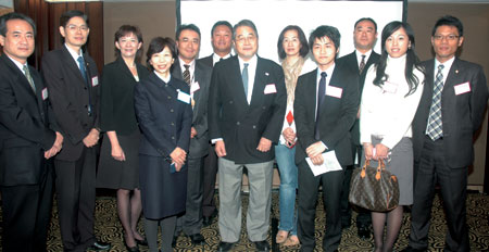 航空公司與秋田縣代表合影。(左起)立榮航空企劃室營業管理部經理劉同義、企劃室協理張建滄、日本亞細亞航空台北分公司營業部經理方曼麗、秋田縣產業經濟勞動部觀光課課長田中昌子、日本亞細亞航空台北支店部長井上晶文、華信航空營業部營業經理周育志、日本觀光協會台灣事務所所長市川辰雄、遠東航空企劃處國際事務組專員潘珍珠、助理專員吳柏寬、日空航空台北支店總務業務經理★功、長榮航空客運本部營業部團體二課盧碧尹、莊凱丞。