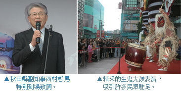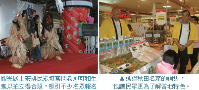 除了針對同業所舉辦的觀光說明會之外,為了吸引一般消費大眾能夠更直接對於秋田縣的觀光特色有所認識,特別於週末假日選在人潮洶湧的SOGO百貨忠孝館1樓廣場舉辦「秋田冬之旅觀光.物產展」,除了同樣在現場安排精采的生鬼太鼓表演之外,並有填寫問卷便可與生鬼合拍拍立得、贈送秋田蘋果以及秋田米的旅遊有獎問答等活動,現場吸引了非常多的民眾參加,氣氛十分熱烈。此外,活動現場除了向民眾介紹秋田縣的觀光特色,也設有旅行社攤位作旅遊商品的宣傳,讓有興趣的消費者可直接洽詢,而同時於地下2樓的活動區設置秋田縣物產展,也提供各種秋田物產的試吃與販售,讓民眾不僅能親眼目睹秋田傳統祭典的熱鬧,更可以直接從美食感受秋田的韻味。