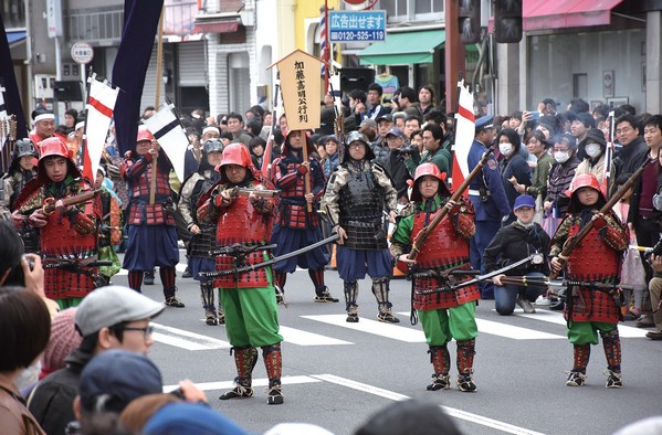 為慶祝松山城小天守再建,自1967年開始舉 辦,以櫻花盛開的松山城和城山公園堀之內地區 為中心,演出者扮裝成戰國時代至大正時代多位 歷史人物登場,來場宛如穿越時空的「大名‧ 武者行列」遊行,並有多項市民活動共襄盛。
