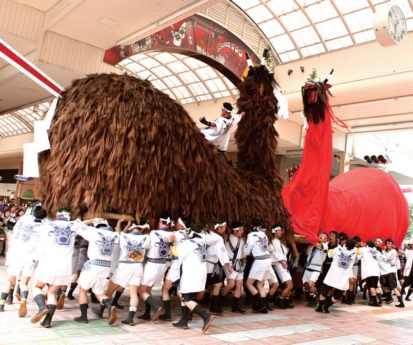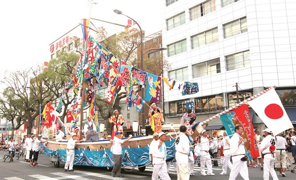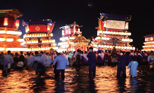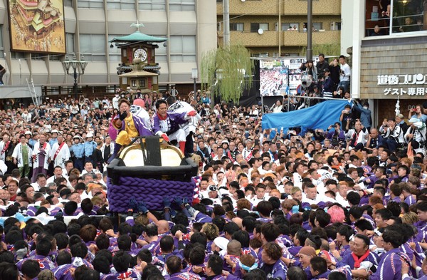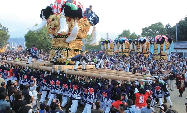 可欣賞充滿陽剛氣息的抬轎競 賽, 連續三天祭典期間, 亮點 是伴隨神轎遶境的山車「太鼓 台」。每個地區都以金碧輝煌的 華麗刺繡布幔彰顯財力,重達3公 噸的大型山車,每輛需超過150人 齊出力移動,最高潮則是各地集 結「太鼓台」的盛大尬陣,場面 震撼。
