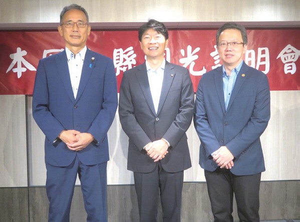 ▲(左起)岡山縣議會議長小倉弘行、岡山縣知事伊原木隆太、台灣虎航商務長兼發言人許致遠。