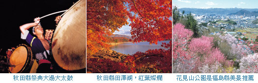 東北六縣春天賞櫻季節來臨,從4月上旬開始~5月上旬為止,繽紛燦爛的櫻花饗宴正式開始。夏季時青森縣內祭典如火如荼的展開,騎馬節、七夕情人節、花笠雪季等傳統節慶,規模之大、陣容之多,親臨現場也可感受那截然不然的文化洗禮。9月下旬楓葉季節來臨,群山遍野紅葉連連,展開一場火樹楓紅的心靈之旅。