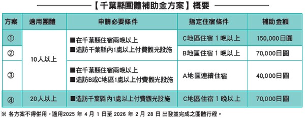 千葉縣正招募秋季旅遊商品並協助9月於LINETravel廣告平台推廣,凡利用【千葉縣團體補助金方案】的商品皆能申請,且方案①、④之C地區商品能優先曝光。請於9/1前提交秋季商品行程表並完成利用申請,詳情與申請方式請洽向日遊顧問有限公司。