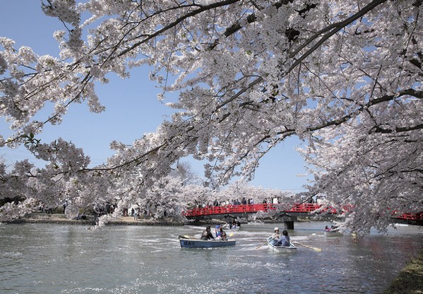 ▲弘前公園賞櫻的玩法眾多,漫步公園內之外也能體驗乘船漫遊護城河內,悠閒享受粉嫩櫻花圍繞。