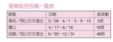 顏公遠進一步表示,在規劃包機航點的考量方向,由於目前熱門航點在包機機位大多已接近飽和狀態,因此在航點的選擇上以目前較少包機飛航的地區為主,像是春季的高松/岡山包機便先規劃5班測試市場,主要著眼在賞櫻旅客的需求,而在富山以及北海道地區之包機則是考量業者的需求推出,顏公遠指出,每年春天立山黑部開山是春季日本線旅遊的重點,而北海道則是考量一年四季都適合包裝行程,因此以年度包機的型態作規劃。