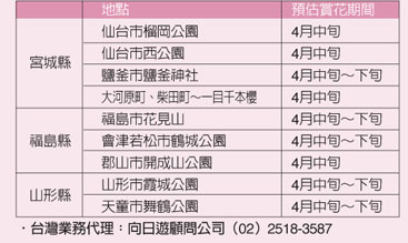 每年4月中旬至下旬便是南東北3縣(福島、宮城、山形)的賞櫻季節,也有相當豐富的賞櫻名所可供包裝,茲整理如下: