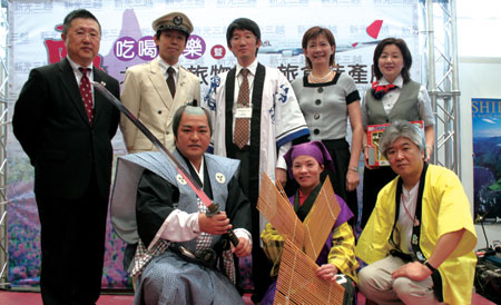 由JR北海道主辦的「北海道旅物語‧旅食特產展」於4/25~5/11在台北新光三越信義店A11舉辦,現場不僅有物產攤位,也請來操作北海道行程的業者如創造、協益、廣德與日本航空設攤,進行旅遊商品解說,同時也接受消費者報名。(後排左2起)日本觀光協會行銷企劃主任矢崎誠、JR北海道旅客鐵道株式會社營業部INBOUND專任課長小野信二、日本航空旅客業務部經理方曼麗、旅客業務部督導薛文秀,與在地業者、伊達時代村的武士表演者合影。(撰文.攝影>蔡雅雯)