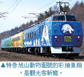 自去年4月開始運行的「特急旭山動物園號」,推出後受到大小朋友的熱烈歡迎,至今年2月底為止搭乘人數已超過3萬人,為了讓更多遊客體驗搭乘樂趣,今年4/26起將增設一「野狼號」車廂,彩繪圖樣以今夏旭山動物園將開幕的「野狼之森」為設計構想,最受歡迎的動物造型椅則有野狼與大角鹿2種,可供旅客合影留念。(圖文提供>日本觀光協會)