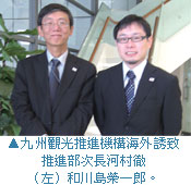 河村徹與川島榮一郎主要負責台灣地區九州觀光的推廣業務,其中河村徹去年底新上任,接手前任次長三浦展的工作。新任次長河村徹曾在美國留學,先後於印尼和上海擔任九州觀光的推廣工作,英文流利、中文略懂,他表示,在接下來的觀光說明會上,將宣告九州今年度的宣傳策略。此外,九州繼去年推動的開車旅行商品大受好評後,今年決定加碼推廣,廣為宣傳GPS衛星導航系統「MAP CODE」的便利性,讓駕車者即使不懂日文,也能藉由「MAP CODE」迅速到達自己要去的目的地。