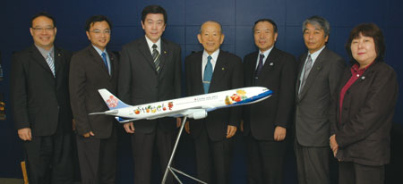 ▲ 長崎縣觀光聯盟會長野崎元治(中)與(左起)中華航空台北分公司客運營業部日本線主任王景弘╱團體部主任羅俊英╱客運營業部經理賴祥光、長崎縣觀光聯盟副會長織方國勝╱專務理事土井正隆╱總務國際部海外誘致課課長代理松尾知子。