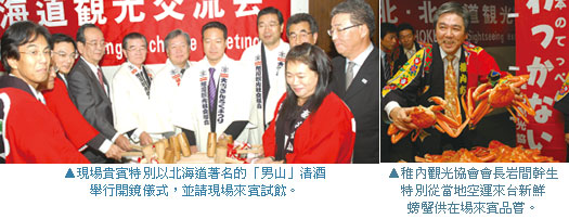 有鑑於一般北海道行程大多以道央以及道南地區為主要活動區域,位於道北地區包括:旭川市、富良野市、稚內市、上川町、東川町、禮文町以及利尻町等8個行政區域日前便連袂搭乘華航旭川包機抵台舉辦推廣活動。首先致詞的稚內市市長橫田耕一表示,「雖然目前道北地區對於台灣旅客而言還有些陌生,但其實它擁有眾多自然景觀以及美食、溫泉,而稚內除了位於日本最北端,鄰近並有禮文以及利尻兩座原始美麗的離島,都是最能夠呈現北海道風情的特色區域。」