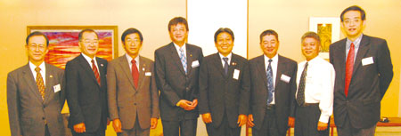 ▲ (左起)松江市宍f0 道湖溫泉代表取締役會長天野久夫、松江市觀光振興部觀光企劃課觀光企劃擔當參事辻f0 孝和、松江市觀光振興部部長森秀雄、台北市公會東北亞旅行委員會召集人林成泰、松江市副市長中村光男、富邦旅行社總經理吳志浤、開達旅行社總經理丁文義、金堡旅行社總經理李謙宏。