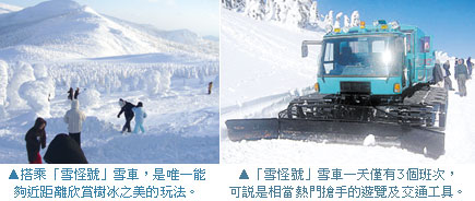為了近距離觀看並深入樹冰群之中感受其充滿魄力的美感,唯有搭乘樹冰號雪車「雪怪號」才能真正完整體會雪原開闊而壯麗的景色,對於許多日本人來說,東北藏王是他們心目中一輩子必定要親身造訪一次的勝地,其中樹冰更是只在藏王高原上幾處有限的地方才有的特殊美景。另外,由於當地的雪質為鬆軟的「粉雪」,對於戲雪、賞雪以及各種雪上活動而言都是絕佳的場地所在,對於行程的包裝而言可說是具有堅強實力。