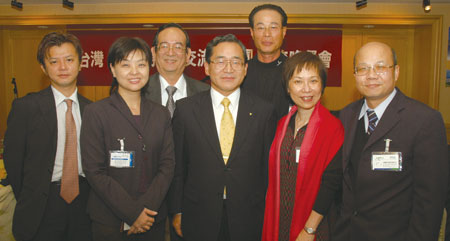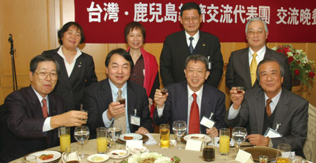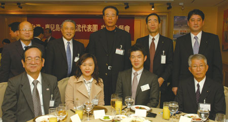 (前排左起)南國交通社長渡邊勝三、觀光局副局長謝謂君、岩崎產業株式會社代表取締役岩崎芳太郎、台灣觀光協會顧問曾前訓;(後排左起)鹿兒島縣議員尾辻義、雄獅旅行社總經理周健、東南旅行社海外旅行事業本部副總經理廖培沅、中華航空台灣地區處長兼台北分公司總經理余劍博。