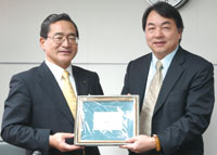 訪問團一行特別造訪華航,由總經理孫洪祥(右)代表接見,雙方並互贈紀念品。