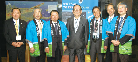 ▲ 日本觀光協會台灣事務所所長井久保敏信(左4)與來台推廣之東北海道相關人員合影。(左起)東北海道觀光事業開發協議會Inbound部會長藤田薰、東北海道觀光事業開發協議會會長根津文博、釧路商工會議所常務理事高橋滋、釧路市港灣空港部次長岩隈敏彥、釧路空港大樓取締役業務部長吉澤彰夫、日本航空釧路支店支店長中村長二。