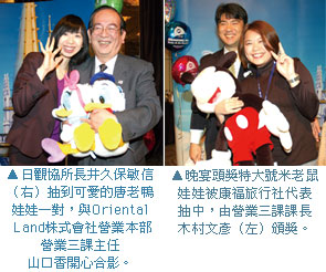 首先於開場代表致詞的Oriental Land株式會社營業本部長柴洋二郎在致詞報告去年成績時表示,去年2008年適逢東京迪士尼渡假區25週年,在總來園人數方面在2008年4月~2009年3月期間共達到2,710萬人次,其中在海外市場的部分2008年1~12月累積共有95萬人次,相較於前年的108萬人次約下滑8%;台灣地區部分則是23萬人次,相較於前年的26萬人次約減少12%,主要應是受到不景氣、以及日圓升值等因素之影響,但仍然相當感謝台灣的旅行同業的支持與送客。