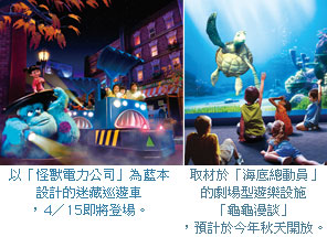 本遊樂設施構思源自迪士尼.皮克斯動畫電影「怪獸電力公司」,共耗時5年、花費100億日圓建成,迷藏巡遊車將邀請遊客搭車一同加入電影中大眼仔「麥克」及毛怪「蘇利文」精心策畫的捉迷藏,並以神奇電筒尋找藏匿在各個角落的怪獸!乘坐時間約4分鐘,每台巡遊車備有兩支神奇電筒,可坐三個人。另外一項設施則是即將於今年秋季在東京迪士尼海洋的劇場型遊樂設施「龜龜漫談」,同樣取材於賣座皮克斯動畫「海底總動員」,耗資20億日圓打造SS哥倫比亞號郵輪場景,結合眾多有趣的動畫角色,讓遊客彷彿置身蔚藍的海洋之中。