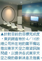 由東武鐵道大力出資、規劃的東京天空之樹,其概念為向天空伸展的樹,在大樹的庇蔭下人們集結一起,心也互相靠攏。除了強調與人類社會的結合之外,地球的環保意識也在其中。在設計方面,強調以最先端的科技,結合日本傳統文化的保持,創造一個超越時空的都市景觀。此建設案也同時結合週邊購物中心,透過整體規劃,預計屆時將帶動週邊繁榮,成為東京都內觀光新景點。(圖片提供>東武鐵道)
