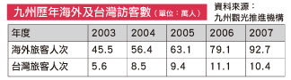 此外,九州由於距離韓國、中國大陸沿海以及台灣等東北亞地區較近,在推廣鄰近海外市場上有一定的優勢,目前造訪九州的外國旅客當中,來自韓國、台灣、中國、香港等亞洲地區的旅客就佔了9成左右。而就國內觀光而言,2010年九州新幹線的鹿兒島線將正式全線開通,屆時對於促進國內旅客造訪九州也將有一定的拉抬效果。