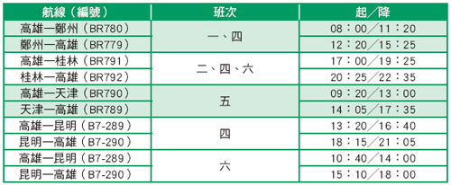 長榮╱立榮開闢之高雄飛往鄭州、桂林、天津、昆明航線,將以MD-90客機飛航,機上配置有商務艙12席、經濟艙140席,航班起降時間如下表。另外,為慶賀新航線的開闢,特別與旅行社共同推出各式優惠行程,「天津承德北京八日」 22,500元起、「鄭州開封洛陽八日」20,000元起、「桂林陽朔五日」16,900元起、麗江古城的「昆大麗八日」30,900元起,優惠活動自即日起至12╱31止。在個人機票方面,凡於11╱30前訂位及購票者,優惠價格為高雄—天津15,300元起、高雄—鄭州17,900元起、高雄—桂林15,800 元起、高雄—昆明16,900元起。