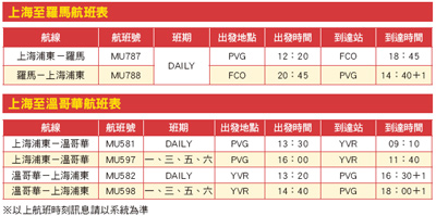東方航空目前提供密集且多樣的航線服務,近來更準備新增美加、歐洲航線。 6月先增班上海往返溫哥華,自6月22日起,新增每週4個航班,每週運行11班。 7月也預計拓編上海往返羅馬航班,將於 7月1日起,新增每週2航班,每週出發達 7班。提供多種時段選擇,讓旅客在行程及時間安排上,不僅省時省力,更使得亞洲旅客至美加、歐洲的交通航線,更加順暢且趨近完美!此外,東方航空為方便商務旅客消費群,近期在承運航班L艙以上機票,已可允許回程OPEN,也取消了直航O艙的改期費、退票費,增加O艙的便利性,讓商務旅客在時程安排上更能彈性操作。