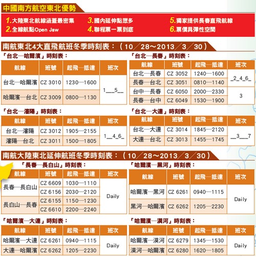 中國南方航空行銷業務課銷售專員謝建祥表示,目前南航東北航線使用的機型分別有執飛哈爾濱的A320,共擁有151個座位;執飛大連、瀋陽、長春的A321,共擁有178個座位。南航在東北冬季航班的部分,每週共有11班直達東北各大門戶。南航在東北佈局的4大航點與密集的班次,還有多個延伸航點,可包裝雙點進出,或是延伸產品的產品,而行程走法也有環狀、單點等相當多元,非常具有優勢。另外,提供全線航點Open Jaw、聯程票一票到底,給予業者充裕的操作空間。