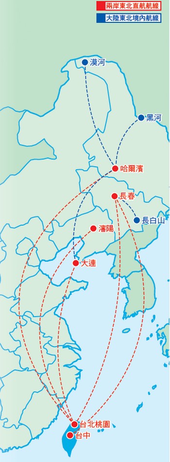 中國南方航空在兩岸航點上深耕已久,在大陸東北航線擁有哈爾濱、長春、瀋陽與大連共4個直飛航點,是兩岸三地航空公司之中,東北航線佈局最為密集的航空公司。尤其自南航於2003年正式併入北方航空,使其在中國東北的航點越加完整,延伸航點也更為綿密。