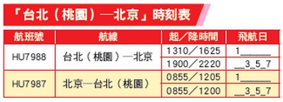 以北京航線的客層表現上來看,多為團體旅客,與散客相較之比例為6:4。而在產品包裝的部分,也分為夏、冬兩季,業者在夏季大多會推出深受台灣人喜愛的絲路行程,機位供不應求;在冬季產品的部分,除了藉由冬季之優勢推出價格更實惠、產品內容最優質的北京產品之外,更善用北京基地之優勢、優質貼心的中轉服務,以海航提供之歐洲航線:布魯塞爾(比利時)、柏林(德國)、蘇黎世(瑞士)3大獨特航點,以創新的旅遊路線,帶給台灣旅遊市場另一歐洲操作選擇。