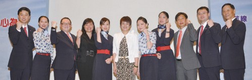 中國東方航空台灣分公司總經理周瑩(中)、客運銷售部總監方南海(左3)、客運銷售部經理熊磊(左1)、銷售經理江謝麗紅(左4)、航站站長曹勇(右2)、貨運銷售部經理劉彬。