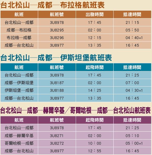 台北松山機場出發 經成都中轉飛往伊斯坦堡、布拉格或赫爾辛基進、哥本哈根出 打造多款歐洲創新商品